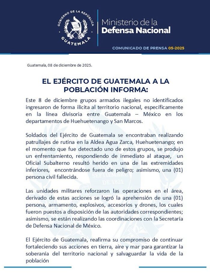 Una portavoz del Ejército detalló que presuntos grupos armados ingresaron a territorio guatemalteco en las provincias de Huehuetenango y San Marcos, realizando disparos contra varias comunidades.