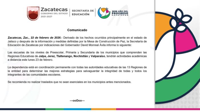 La Secretaría de Educación de Zacatecas, por su parte, anunció que las escuelas de preescolar, primaria y secundaria en las regiones de Jalpa, Jerez, Tlaltenango, Nochistlán y Valparaíso impartirán actividades académicas a distancia.
