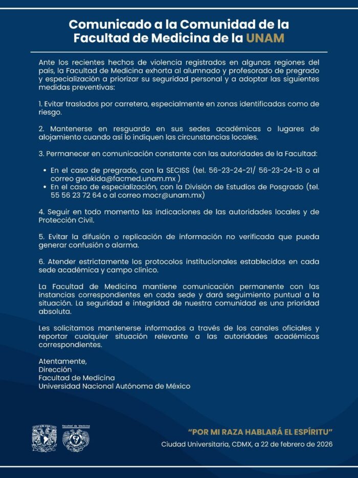 “Evitar traslados por carretera, especialmente en zonas identificadas como de riesgo” y “mantenerse en comunicación constante con las autoridades de la Facultad”, e indicó seguir “en todo momento las indicaciones de las autoridades locales y de Protección Civil” y evitar la difusión de información no verificada.